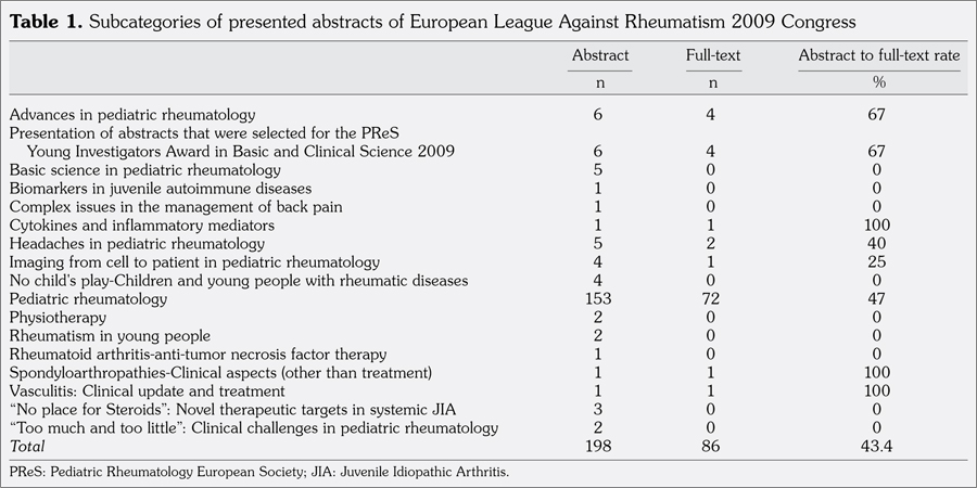 Although the publication rates of a pediatric rheumatology congress were reported,(3) to our knowledge, no research was conducted on full-text publication rates of pediatric rheumatology abstracts which were presented in a general and leading rheumatology congress such as the Annual European Congress of Rheumatology of the European League Against Rheumatism (EULAR). Therefore, in this study, we aimed to evaluate the publication rates and features of the abstracts related to pediatric rheumatology presented in EULAR 2009 congress.