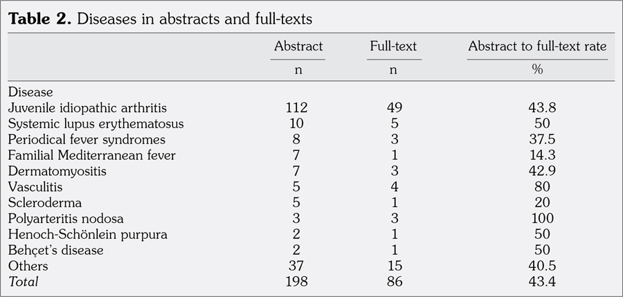 Methods: A systematic search was performed to find full-text publications of abstracts related to pediatric rheumatology in European League against Rheumatism 2009 congress. Full-text publication rate, the elapsed time between presentation and full-text publication, type of the disease in the studies, distribution of abstracts and full-texts according to countries, journals, and presentation types were investigated.