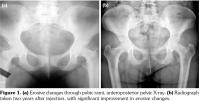 To the best of our knowledge, there is no report showing radiographic resolving after symphysis pubis injection. Two cases have been reported with radiographic improvement, which were treated with oral and intravenous corticosteroids. The first is a 60-year-old female patient who had pubic pain after urinary incontinence surgery. She was treated with intravenous glucocorticoids and had a rapid symptom relief. One year after treatment, radiographic improvement was shown.(7) The second is a 57-year-old female spondyloarthropathy patient who had mild symptom relief with non-steroidal anti- inflammatory drugs and oral corticosteroid therapy. She had severe periodontitis. After treatment of infection, her symptoms relieved completely. Two years after clinical onset, the radiograph was totally normal.(8) Since steroids have an anti-inflammatory effect, recovery via steroid injection was observed radiographically and clinically.
