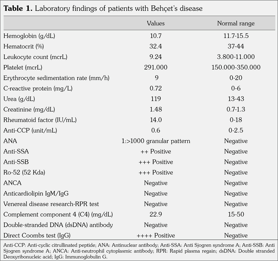 - Yazmalar L, Batmaz ‹, Sula B, Alpaycı M, Aydın F, Türkçü F, et al. Serum levels of alpha-1 acid glycoprotein and pentraxin 3 in patients with Behçet's disease and relationship with disease activity. Int J Dermatol 2015;54:394-400.