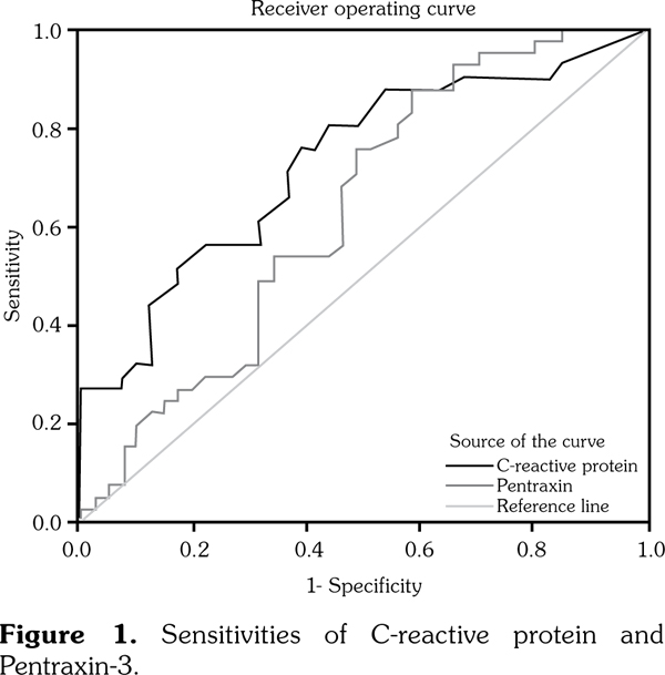Behçet’s disease (BD) is a chronic, relapsing multisystemic disease characterized with nonspecific vasculitis that affects various sizes of vessels. The highest prevalence was reported in the Eastern Mediterranean and in Asia.(1,2) Inherited and adaptive immunity accompanied with bacterial and viral infections, activations of neutrophils, natural killers, and cytotoxic T cells were found to be responsible in the etiology.(3-5) BD’s association with human leukocyte antigen-B51 (HLA-B51) gene is well known, however there is no certain laboratory parameter for the diagnosis or follow-up of BD. Pentraxins (PTXs) are acute phase proteins that affect humoral arm of congenital immunity.(6) They are divided into two groups as short and long PTXs.(7,8) C-reactive protein (CRP) is the prototype of the short PTX family mainly produced in the liver in response to inflammatory signals and PTX-3 is the prototype of the long PTX family.(9,10) While CRP is produced by hepatocytes, PTX-3 is produced by different cell types and functions locally. Different from classic PTXs, PTX-3 is secreted as a response to interleukin-1 beta and tumor necrosis factor alpha. PTX-3 plays a complex role in vivo, recognizing a diverse range of pathogens modulating complement activity by binding C1q and facilitating pathogen recognition by macrophages and dendritic cells. Because of this extrahepatic synthesis in contrast to CRP, PTX-3 levels are believed to be a more reliable indicator of disease activity produced at sites of inflammation.(11) Increased levels of PTX-3 have been observed in some autoimmune disorders.(11,12) In small vessel vasculitis, PTX-3 levels correlate with clinical activity of the disease and represent a candidate marker for monitoring the disease.(11) Nevertheless, there is only one recent report investigating PTX-3 association in patients with BD and BD’s activity. Therefore, in this study, we aimed to assess the level of PTX-3 as an inflammatory marker and compare it with CRP levels in patients with BD.