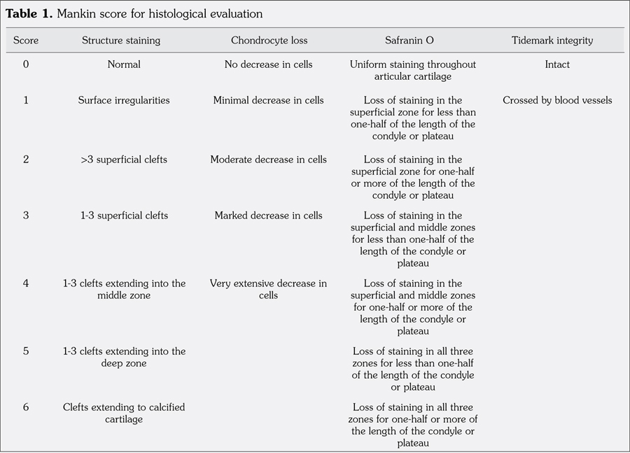 - van der Sluijs JA, Geesink RG, van der Linden AJ, Bulstra SK, Kuyer R, Drukker J. The reliability of the Mankin score for osteoarthritis. J Orthop Res 1992;10:58-61.
