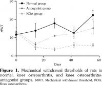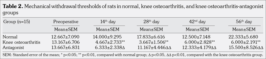 Patients and methods: Forty-five four-month-old Sprague Dawley male rats, weight ranging from 440 g to 470 g, were randomly allocated into three groups, namely KOA group, KOA-antagonist group, and normal group. Mechanical withdrawal thresholds of five rats from each group were detected one week before modeling, and two, four, six, and eight weeks after modeling, respectively. Synovial and cartilage tissues from diseased knee were collected after sacrificing the rats eight weeks after modeling so to observe pathological morphology at cartilage tissues and to determine protein and gene expressions of TRPA1 and TRPV4 at synovial tissues.