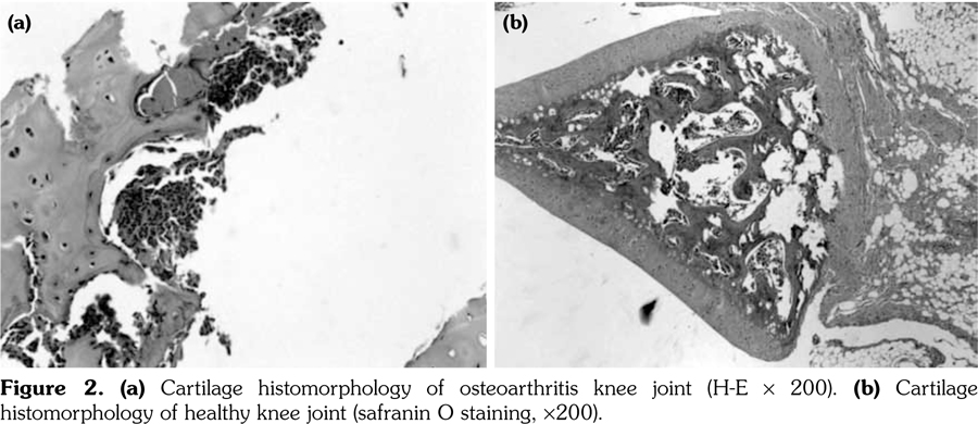 In KOA group, joint cartilage demonstrated rough and irregular surface, yellow with loss of normal luster and elasticity and had distinct bunchy fiber changes, fracturing, eroded changes, softening and coloboma. In normal group, joint cartilage remained semitransparent with luster and elasticity, smooth edge, and showed no fracturing, softening, defects or osteophyte formation (Figure 2).