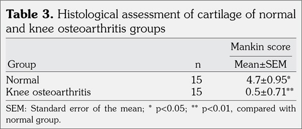 Light microscopic observation and Mankin’s evaluation revealed defects on cartilage surface, full-thickness chondral defects with many fissurations downward extending to radiating layer, blurring in layering and irregular in structure, tidemark broken and calcified layer distinctly thickened in KOA group. In normal group, cartilage surface appeared smooth and regular with no fracture or defect. Chondrocytes lined up neatly with four regular structure layering, staining evenly distributed and tidemark being clear and complete (Table 3).