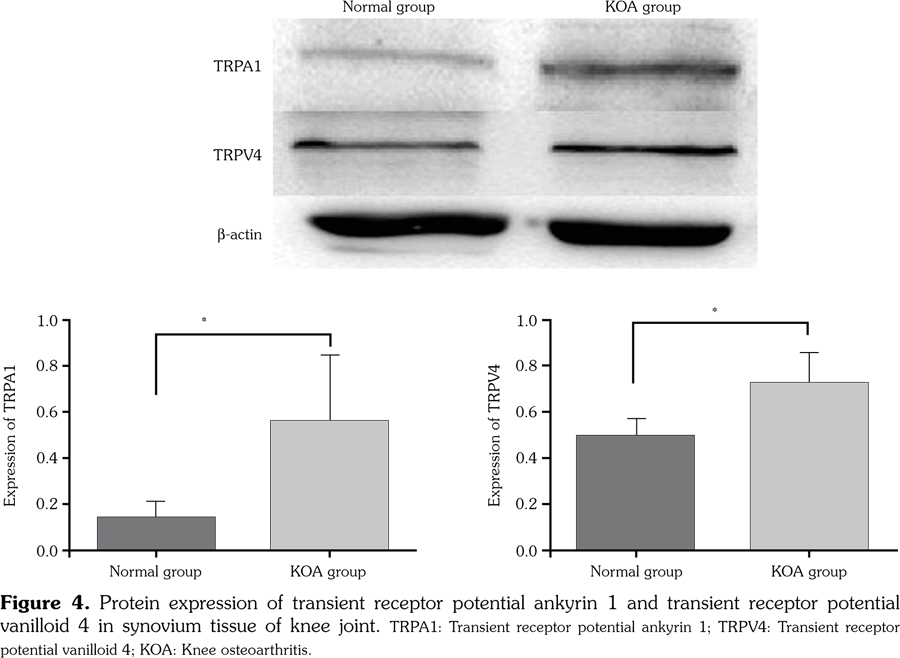 Both TRPA1 and TRPV4 expressions from diseased synovial tissues of KOA group were statistically higher than those of normal group (p<0.05) (Figure 4, Table 4). Both TRPA1 and TRPV4 gene expressions in KOA group were statistically higher than those in normal group (p<0.05) (Figure 5, Table 4).