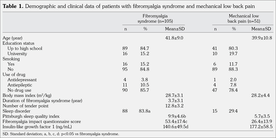 Results: Sleep disorder was detected in 88 patients in FMS group and 15 patients in control group (p<0.05). The PSQI score was higher in the FMS group compared to the control group (9.9±4.6 vs. 5.7±3.5). The FIQ score was higher in the FMS group compared to the control group (53.4±17.4 vs. 26.4±13.9; p<0.05). The serum IGF-1 level of FMS group was significantly lower than that of the control group (140.6±49.5 ng/mL vs. 177.2±58.5 ng/mL; p<0.05). In the FMS group, an examination of the correlation between serum IGF-1 level with the age, body mass index, obstructive sleep apnea syndrome, FIQ, and PSQI revealed a negative correlation between serum IGF-1 with the age and PSQI. The obstructive sleep apnea syndrome ratios of study groups were comparable with regard to the frequencies of mild, moderate, and severe obstructive sleep apnea syndrome.