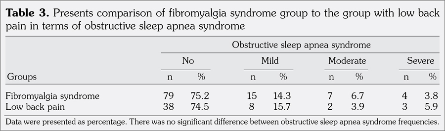 A comparison between FMS and control groups in terms of OSAS frequency revealed that 15, seven, and four patients in the FMS group had mild, moderate, and severe OSAS, respectively; whereas eight, two, and three patients in control group had mild, moderate, and severe OSAS, respectively (Table 3).