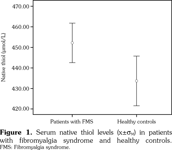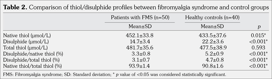Patients and methods: Fifty female patients with FMS (mean age 40.5±7.2 years; range 21 to 55 years) and 40 healthy female controls (mean age 39±9.4 years, range 22 to 55 years) were included in the study. Pain visual analog scale, tender points, Fibromyalgia Impact Questionnaire, and Beck Depression Inventory were evaluated. Age, body mass index (BMI), and symptom durations were also recorded. Native thiol, disulphide and total thiol levels were measured with a novel automated method.