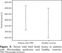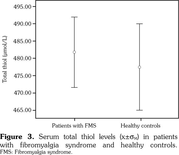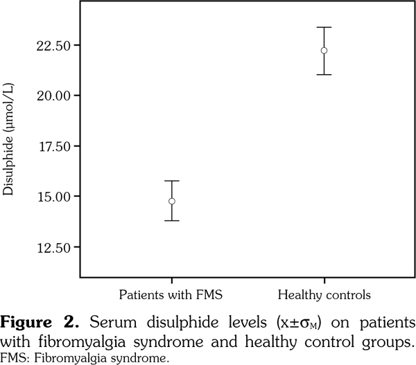 Results: Serum disulphide levels were 14.7±3.4 μmol/L and 22.2±3.6 μmol/L in the FMS and control groups, respectively (p<0.001). Native thiol levels were 452.1±33.8 μmol/L and 433.5±37.6 μmol/L in the FMS and control groups, (p=0.015), while total thiol levels were 481.7±35.6 μmol/L and 477.5±38.9 μmol/L in the FMS and control groups, respectively (p=0.593). In the FMS group, disulphide/native thiol percent ratios and disulphide/ total thiol percent ratios were statistically significantly lower and native/total thiol percent ratios were statistically significantly higher than those of the control group. There were no correlations between serum thiol/disulphide profiles and pain scores & clinical variables in patients with FMS.