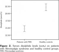 In this study, plasma dynamic thiol/disulphide homeostasis was determined by the recently developed method by Erel and Neselioglu(25) in patients with FMS for the first time. In their preliminary studies, they showed that plasma disulphide levels were higher in patients with degenerative diseases, such as diabetes, smoking, obesity, and pneumonia, and were lower in patients with proliferative diseases, such as multiple myeloma, colon cancer, and renal cancer.(36-38) We found lower disulphide levels in patients with FMS compared with the healthy controls. However, we did not observe any difference in total thiol levels between the two groups.