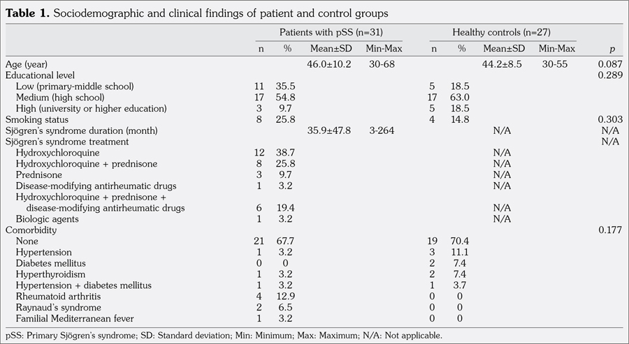 Mean duration of pSS in the patient group was 35.9 months (range 3 to 264 months). The most commonly used agent for the treatment of pSS was hydroxychloroquine, alone or in combination with prednisone (n=20, 64.5%). pSS patients did not show significant differences from healthy controls in terms of education level, smoking status, or comorbidities (p>0.05 for all, Table 1).