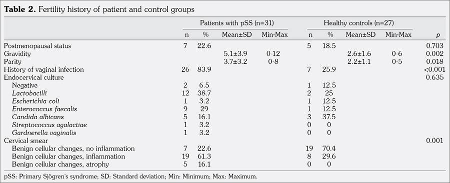 Disease onset following menopause is a common occurrence in pSS patients.(22) However, in our study, there was no difference between pSS patients and controls in terms of rate of postmenopausal females. Previous studies reported no difference in fertility, parity or reproductive success rates between pSS patients and controls.(12) However, in the present study, gravidity and parity rates were significantly higher in patients with pSS.