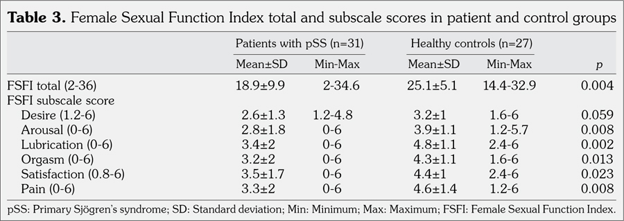 Although recent immunologic and clinical researches led to significant advances in diagnosis and management of pSS, there is rather a small number of studies on the impact of the condition on sexual functionality of females.(1,2,21) van Nimwegen et al.(14) recently studied the impact of pSS on female sexual function by a number of self-administered questionnaires including FSFI on 46 patients and 43 age-matched controls and found that females with pSS have disrupted sexual function and more sexual discomfort compared with healthy controls. In the mentioned study,(14) median total FSFI scores were 20.6 and 30.3 for females with and without pSS, respectively. They also found that sexual function is affected by physical factors such as vaginal dryness, pain and fatigue, and psychological involvement of pSS. Similarly, in the present study, we found mean FSFI total scores as 18.9 and 25 in patients with pSS and age-matched healthy females, respectively (p=0.004), showing the impairment of sexual functionality in females with pSS. Furthermore, as in the study by van Nimwegen et al.,(14) five out of six domains of FSFI -arousal, lubrication, orgasm, satisfaction, and pain- were significantly lower in patients with pSS in our study. In the study by van Nimwegen et al.,(14) all subscale scores were significantly lower in females with pSS except for satisfaction score.