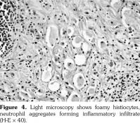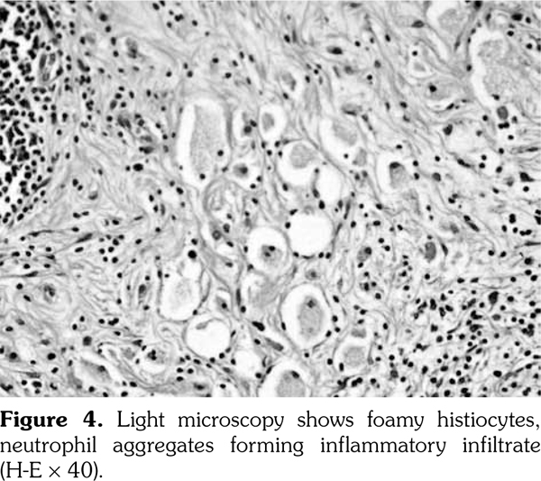 A 51-year-old male patient admitted to our outpatient clinic with complaints of flank pain and fatigue. He had a history of renal stones and peripheral arterial disease. He had a medically unmanageable hypertension. Blood pressure was 200/110 mmHg. Serum creatinine level was 1.2 mg/dL. He was evaluated with contrast- enhanced multislice computed tomography. Along with small calyceal stones, there was bilateral, quite symmetrical perinephric ''rind-like'' soft tissue infiltration. Right kidney was atrophic but still functioning without pelvicalyceal contrast excretion. The soft tissue infiltration obliterated both renal hila and caused proximal ureteral stenoses with mild calyceal dilation on the left side (Figures 1 and 2). Distally, the ureters were normal. Incidentally, abdominal aorta, common iliac arteries, proximal celiac trunk, and proximal renal arteries were noticed to appear “coated” with subtle perivascular tissue infiltration. An endovascular aortoiliac stent-graft was in place. He rejected any further diagnostic intervention after he presented with a blood creatinine of 2.2 mg/dL. He underwent an unenhanced computed tomography examination with the same findings before. Renal scintigraphy revealed a non-functioning right kidney. Perinephric soft tissue infiltration was considered as the differential diagnosis of ECD. Direct radiographies of the extremities were obtained. All of the long tubular bones showed diametaphyseal cortical and patchy medullary sclerosis reinforcing the diagnosis of ECD (Figure 3). The patient underwent right nephrectomy for the control of hypertension and a double-J stent was placed on the left side for the relief of ureteral obstruction. The nephrectomy specimen showed the typical histological features of ECD. Serum creatinine level dropped to the borderline values after the operation and his blood pressure was in the normal range with medications. The pathological analysis of the nephrectomy specimen revealed an inflammatory infiltrate formed by foamy histiocytes that were positively stained for CD68 and neutrophilic aggregates which confirmed the preoperative diagnosis (Figures 4 and 5). A written informed consent was obtained from the patient.