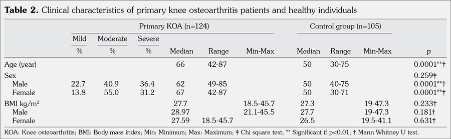 Patients and methods: One hundred and twenty-four individuals (44 males, 80 females; median age 66 years; range 42 to 87 years) were diagnosed with primary knee osteoarthritis according to the American College of Rheumatology guidelines. Additionally, 105 healthy healthy individuals (49 males, 56 females; median age 50 years; range 30 to 75 years) were included as the control group. For both groups, a thorough clinical history and physical examination were performed. Moreover, weight-bearing anteroposterior and lateral bending 30 degrees knee X-rays were collected. Cartilage oligomeric matrix protein in serum and synovial fluid was measured by enzyme-linked immunosorbent assay.