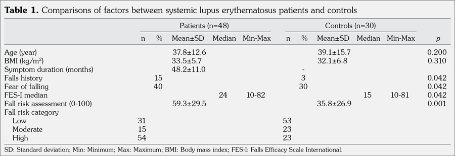 Patients and methods: A total of 48 female patients (mean age 37.8±12.6 years; range 18 to 65 years) with SLE and 30 female controls (mean age 39.1±15.7 years; range 19 to 66 years) were included. Age, disease duration, anamnesis of falls, fear of falling, and drugs used were recorded. Disease activity (measured with SLE disease activity index Safety of Estrogens in Lupus Erythematosus National Assessment modification) and damage (measured with Systemic Lupus International Collaborating Clinics/American College of Rheumatology Damage Index) were evaluated. For the evaluation of fall efficacy, we used the Falls Efficacy Scale International. Fall risk analysis was performed by using a computerized posturography device.