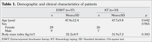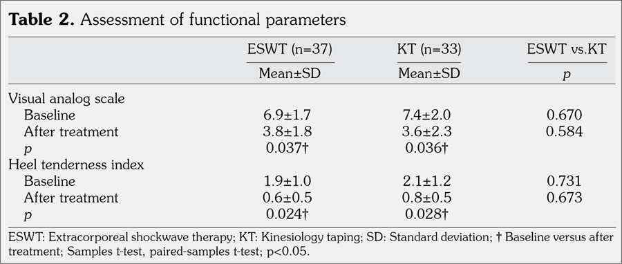 Patients and methods: The study included 80 patients diagnosed with plantar fasciitis. The patients were randomized into two groups as ESWT (9 males, 28 females; mean age 47.8±12.4 years; range 40 to 55 years) and kinesiology taping (KT, 7 males, 26 females; mean age 47.7±9.8 years; range 40 to 55 years) groups. Groups were similar regarding age, sex, and body mass index (all p>0.05). Three patients in ESWT group and seven patients in KT group were lost to follow-up. ESWT was applied once a week for five weeks, while KT was applied every five days for five weeks. Patients’ pain and functional status were evaluated with visual analog scale, heel tenderness index, and foot and ankle outcome score before and after treatment.