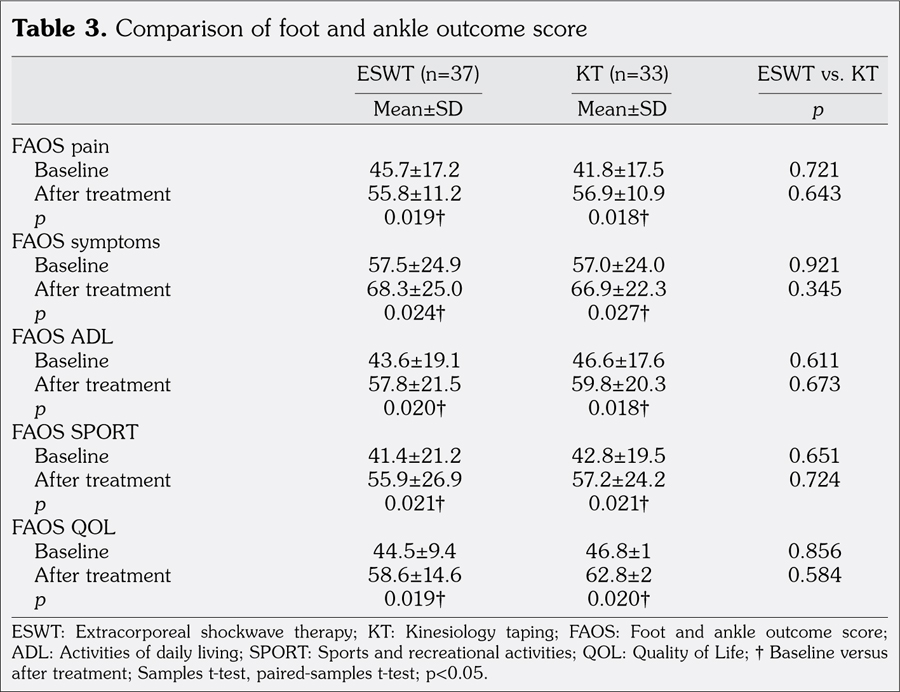 The ESWT and KT groups were similar regarding age, sex, and body mass index (all p>0.05) (Table 1). At the study onset, there were no statistically significant differences between the two groups in their VAS and HTI scores, and FAOS. Five weeks later, both groups showed significant improvement in all parameters within the groups (all p<0.05), but no significant differences were observed between the groups in the VAS and HTI scores (Table 1) and FAOS (Table 2).