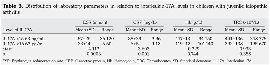 Results: Serum levels of IL-17A in children with JIA were significantly higher in comparison to control group. In children with JIA who were prospectively monitored, statistically significantly decreased IL-17A level was recorded in the inactive phase of the disease. The incidence of arthritis of coxofemoral joints was significantly more common, and the mean levels of erythrocyte sedimentation rate and C-reactive protein were significantly higher in the group of children with JIA with detectable levels of IL-17A. Children with JIA and detectable levels of IL-17A had significantly higher values of Juvenile Arthritis Disease Activity Score-27 in comparison to children with JIA and non-detectable IL-17A.