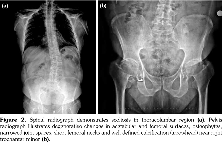 A 42-year-old male patient was examined due to gait difficulty and pain in hip and knee joints bilaterally and low back. He declared that he could walk independently, yet he had some difficulties in walking on undulating surfaces or climbing up stairs. Medical and family history was noncontributory. He was 168 cm tall and weighed 78 kg. Physical examination revealed severe restriction of range of motion in hip joints, crepitation in knee joints, hyperextension position of the first metacarpophalangeal joint, and deviation of the thumbs. Adam’s test for scoliosis was positive and lumbar motions were limited as well. Minimal joint effusion was detected in knee joints as well. Knee radiographies showed double- layered patella (DLP), generalized degenerative changes, scoliosis, and circumferential radiopaque lesion around the right hip joint (calcification of the iliopsoas bursa) (Figures 1 and 2). Magnetic resonance imaging designated the association between the quadriceps tendon and patella (Figure 3). Laboratory investigations including erythrocyte sedimentation rate and C-reactive protein, calcium, phosphate, and alkaline phosphatase levels were all within normal limits. Overall, the patient was diagnosed with secondary OA due to MED and referred to another center for further genetic analysis. A written informed consent was obtained from the patient.