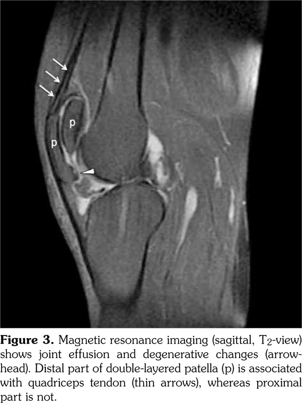 Our patient with clunking in the knees had DLP bilaterally, which was reported previously in the literature.(8) DLP is a type of bipartite patella and caused by a septum dividing the patella into segments. It can be seen completely or partially. In general, DLP is associated with MED; however, it is reported in nondysplastic subjects as well.(9) Our patient had the total form of DLP. Magnetic resonance imaging showed that the distal part of the DLP was responsible for the extensor mechanism of the knees. This condition is important because the functional part could be indicative for a possible surgical procedure or functionality of the knee movements.