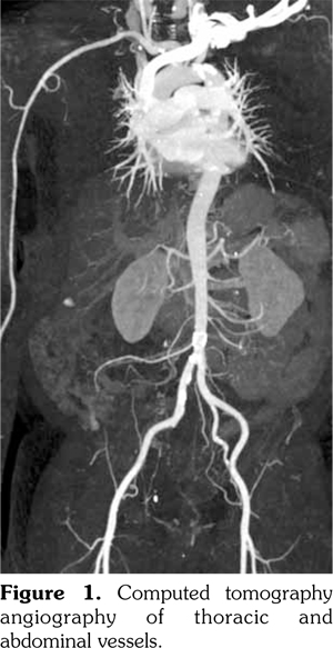 A 56-year-old male patient presented with high grade fever and headache for a month associated with proximal myalgias, right ankle synovitis, and bilateral orchitis. His general examination was remarkable for the thickened right superficial temporal artery with scalp tenderness. Lab tests revealed an erythrocyte sedimentation rate of 112 mm/at the end of 1st hour, a C-reactive protein level of 396.3 (<5) mg/L, normal liver and kidney functions, and an unremarkable urine microscopy. His anti- nuclear antibodies, cytoplasmic-anti-neutrophil cytoplasmic antibodies, perinuclear-anti- neutrophil cytoplasmic antibodies, and hepatitis serology were all negative. Ultrasound Doppler of the testes revealed increased vascularity suggestive of orchitis and funiculitis in both testes. Computed tomography angiography of thoracic and abdominal vessels revealed no evidence of vessel aneurysms or stenosis (Figure 1). The temporal artery biopsy (TAB) revealed dense mixed inflammatory infiltrate consisting predominantly of lymphocytes and histiocytes involving the tunica adventitia, and the media with an extension into the intima and near complete destruction of external elastic lamina and focal disruption of internal elastic lamina (Figure 2). There was no fibrinoid necrosis, leukocytoclasia or giant cells in the examined biopsy specimen. Patient was then treated with pulse intravenous methylprednisolone followed by oral steroids and methotrexate. Resolution of symptoms was noted over four weeks. Currently, after six months of follow-up, the patient is stable and on weekly subcutaneous methotrexate 20 mg along with prednisolone five mg/day. A written informed consent was obtained from the patient.