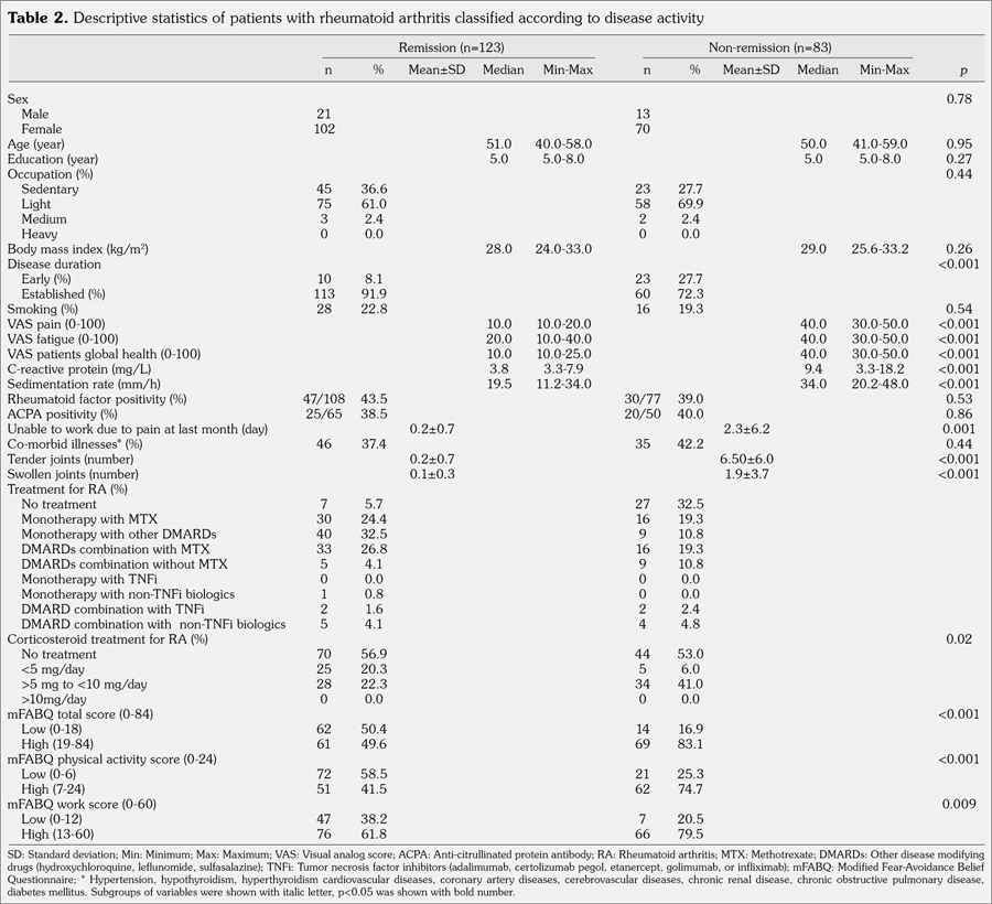 More patients in non-remission group had early disease (p<0.001). However, in both groups, most of the patients had established disease. VAS scores were higher in non-remission group (all p<0.001). Sedimentation rates and C-reactive protein values were also higher in non-remission group. Moreover, number of lost days being unable to work due to pain during last month was higher in non-remission group. Non-remission group was on higher corticosteroid dosage in the course of the study. Furthermore, non-remission group had higher number of tender and swollen joints (both p<0.001). Modified Fear-Avoidance Belief Questionnaire total (p<0.001), mFABQ physical activity (p<0.001) and mFABQ work (p=0.009) scores were higher in non-remission group (Table 2).