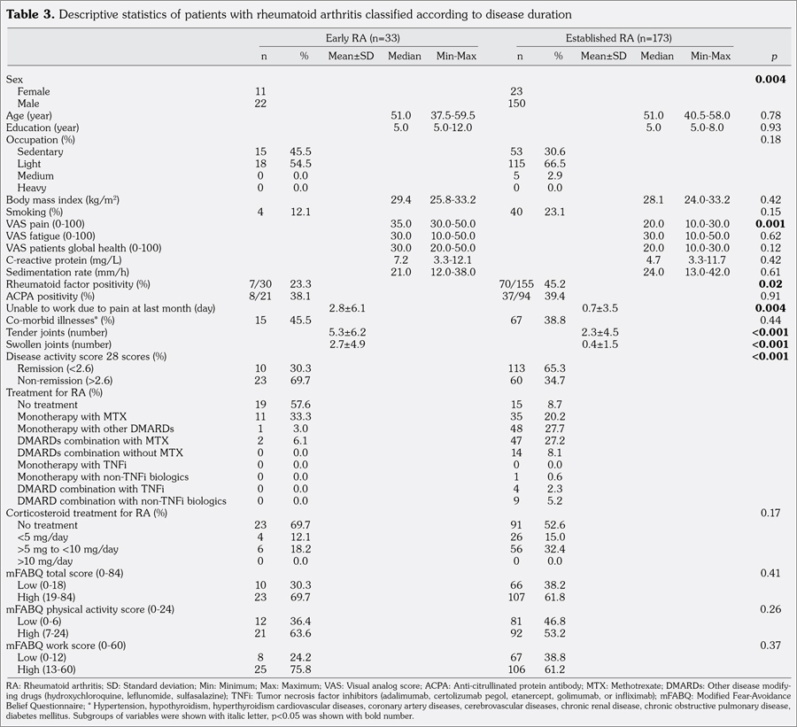 Majority of the patients in early disease group had active disease, conversely, more than half of the patients with established disease were in remission (p<0.001). Only VAS pain score was higher in early disease group (p=0.001). Both VAS fatigue and VAS patients’ global health scores were similar in early disease and established disease groups. Furthermore, number of tender joints (p<0.001), swollen joints (p<0.001) and lost days being unable to work due to pain during last month (p=0.004) were higher in early disease group (Table 3).