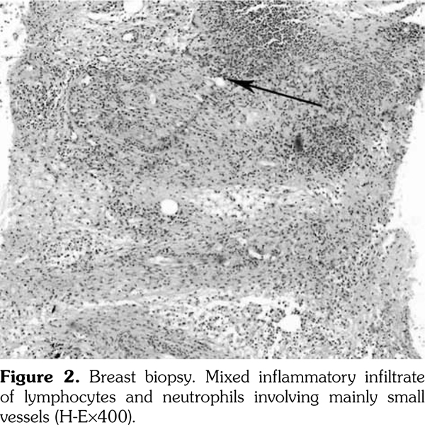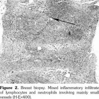 During each subsequent monthly hospitalizations, the patient remained in good general condition, the proteinuria and creatinine serum levels were within normal range. At one of the follow-up visits, nearly one month after the fifth pulse of cyclophosphamide, the patient reported thickening of the right breast, dry cough, and weakness. Chest X-ray demonstrated infiltrative lesion in the upper left lung field (Figure 1). A mild anemia was found, while breast ultrasound confirmed presence of knobby changes in the right breast. Accordingly, the administration of the next cyclophosphamide pulse was postponed and the patient was referred for oncologic consultation. Within the oncology clinic, a needle biopsy of the breast lesion was performed, revealing no neoplastic cells and the histopathological image corresponding to infiltration in the course of granulomatosis with polyangiitis gathering mainly around small size blood vessels (Figure 2). On the basis of infiltrative changes in the lungs, the result of breast biopsy, and presence of anti-neutrophil cytoplasmic antibodies, the recurrence of the underlying disease was diagnosed. Accordingly, the prednisone dose was increased to 1 mg/kg with subsequent tapering to 15 mg/day. Thus a gradual decrease in C-reactive protein levels with improvement of the patient's condition was observed. After a few days, a pulse of intravenous cyclophosphamide (1000 mg) was administered. Following intensification of immunosuppressive therapy, patient’s condition improved, and normalization of serum C-reactive protein was noted. Following five weeks, a control chest X-ray demonstrated no lung infiltrations. Since then, two pulses of cyclophosphamide (1000 mg each, four weeks apart) were given and the treatment with azathioprine, 100 mg per day, has been started. Currently, the patient remains in complete remission.