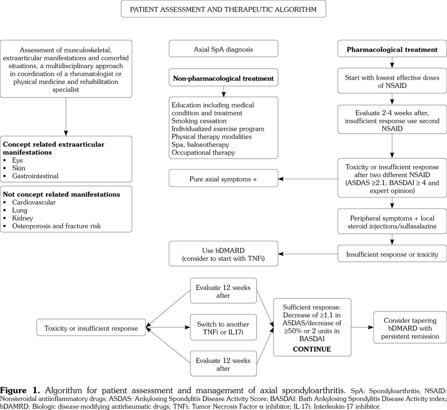 The standardized morbidity rates are increased for uveitis, inflammatory bowel disease, psoriasis, osteoporosis and atrioventricular blocks. Ischemic heart disease and hypertension are other comorbid situations with increased frequency.(19,20) It was emphasized that the treatment in SpA should be adjusted considering the extraarticular symptoms and signs, and comorbidities and that the most convenient treatment may be achieved when collaborated with relevant specialists in case of multisystem involvement.(5,18,19) Rheumatology or physical medicine and rehabilitation specialists should be the coordinator in this multidisciplinary approach.