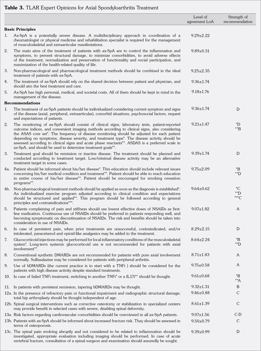 The systematic literature search included articles in English published in 2012-2017 in PubMed- Medline, and Scopus. The recommendations, systematic reviews, and meta-analyses including pharmacologic and non-pharmacologic treatment were scrutinized paying special attention with convenient key words. Of the studied articles, 14 were guidelines.(4-17) The articles were analyzed, summarized, and discussed. The draft of TLAR opinion whose roof consisted of international treatment recommendations, particularly the ASAS/EULAR Recommendations was composed. As well as containing certain original concepts, general structure of the draft pursued model of other international recommendations.