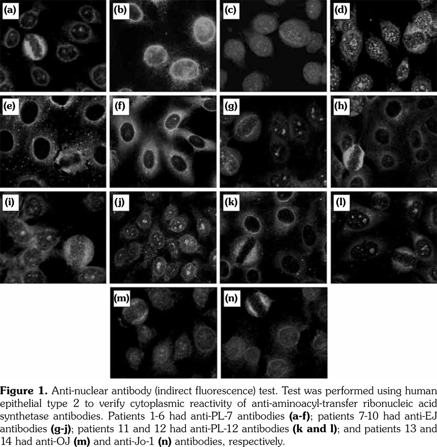Sera from 14 patients who tested positive for anti-ARS antibodies were screened for anti-cytoplasmic antibody using indirect immunofluorescence test and commercially available human epithelial type 2 monolayer slides (Medical & Biological Laboratories, Co., Ltd., Nagoya, Japan). The sera were diluted 1:100 in phosphate-buffered saline (PBS) and incubated at room temperature for 45 minutes. After incubation, the slides were rinsed in PBS, followed by incubation with fluorescein isothiocyanate- conjugated goat anti-human immunoglobulin G (KPL, Gaithersburg, MD, USA) diluted 1:50 in PBS as a secondary detecting reagent, for 45 minutes at room temperature. After washing with PBS, the staining pattern was examined.