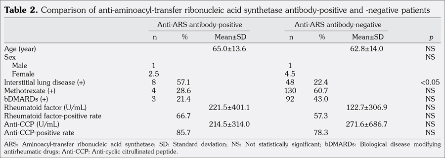 Results: Anti-ARS antibodies were detected in 14 RA patients (6.1%). ILD complications were significantly higher among anti-ARS antibody-positive patients (57.1% vs 22.4%, p<0.05). Levels of anti-threonyl-tRNA-synthetase (anti-PL-7) and anti-alanyl-tRNA-synthetase (anti-PL-12), two anti-ARS antibodies, were higher in RA patients with concurrent ILD (both p<0.05). Myositis and ILD worsening were not observed in three anti-ARS antibody- positive patients despite biological disease modifying antirheumatic drug administration. There was no difference in anti-cyclic citrullinated peptide and rheumatoid factor specificities between patients with or without ARS antibodies.