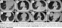 Table 4 contains detailed information (anti-ARS antibody status, age, sex, MTX and bDMARDs treatments, anti-CCP, and RF values) for patients who tested positive for anti-ARS antibody and had also ILD. MTX was administered to one patient while bDMARDs were administered to three patients. Abatacept and etanercept were administered to two and one patients, respectively. Except for one patient who tested positive for anti-PL-7 antibody, anti-CCP antibody and RF titers were high. Chest CT revealed that these patients did not have PM/DM during the clinical course of the disease (Figure 2). Chest CT scans revealed non-specific interstitial pneumonia lung complications in all patients. No characteristic changes were associated with the respective anti-ARS antibodies detected in patient sera. Moreover, patients with rapid progression of lung complications were absent.