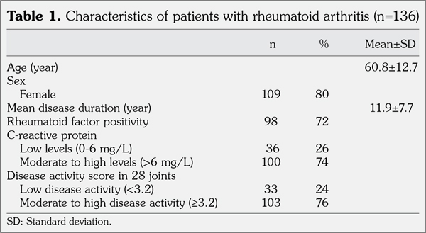 The study, which was conducted at Ioannina University Hospital between February 2012 and August 2016, included 136 unrelated patients with RA (27 males; 109 females; mean age 60.8 years; range 39 to 75 years). RA patients were classified according to the American College of Rheumatology criteria.(28) The demographic characteristics of patients are shown in Table 1.