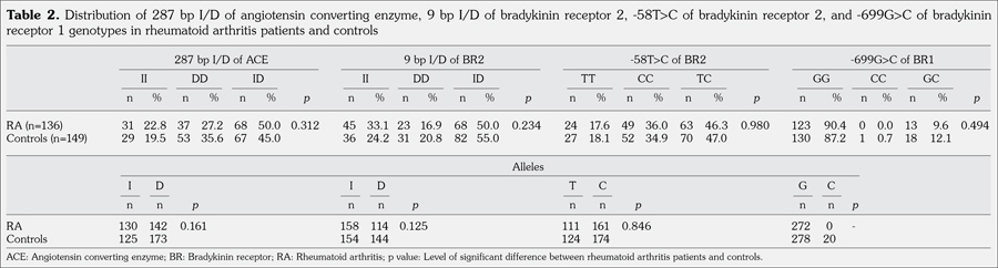 Previous studies reported increased levels of ACE and BK in RA synovial fluid and up-regulation of BR1 and BR2.(3,11-16) Furthermore, KNG gene showed differential expression in studies of its association with RA,(17-19) while genome wide screens revealed that BR1 may be related to RA.(20) Additionally, to our knowledge, only one study in the literature described the association of the insertion/deletion polymorphism in ACE gene with RA.(21) Therefore, genetic variants that may affect ACE, BK, and BR genes expression and function may predispose to RA manifestation. Even though the role of KKS in autoimmunity and RA is reviewed extensively in the recent literature,(22) no genotypic data and associations are reported. Consequently, the present study is the first that examineds extensively the relationship of certain functional polymorphisms of KNG, ACE, BK, BR1 and BR2 genes with RA susceptibility.(2)