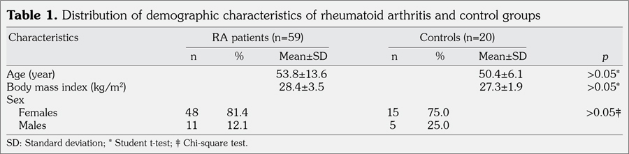 Demographic characteristics were similar between RA and control groups, with no statistically significant difference in terms of sex, age, and body mass index (p>0.05) (Table 1).