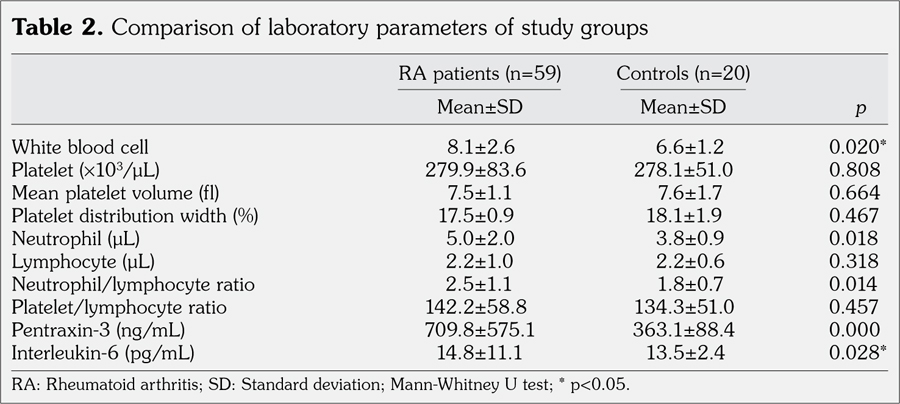 Results: Demographic characteristics were similar between the two groups, with no statistically significant difference in terms of sex, age, and body mass index (p>0.05). NLR, PTX3 and interleukin-6 levels were higher in patients with RA than the control group (p<0.05). While erythrocyte sedimentation rate had a positive correlation with mean platelet volume, we found no correlation between NLR and other parameters of disease activity, PTX3, and interleukin-6.