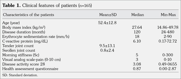 Patients and methods: This cross-sectional study included 165 RA patients (36 males, 129 females; mean age 52.4±12.8 years; range 21 to 82 years). Disease duration, age at disease onset, smoking habits, rheumatoid factor (RF), and anti-cyclic citrullinated peptide levels were recorded. Morning stiffness, pain with visual analog scale, Health Assessment Questionnaire Scores And Disease Activity Score 28 were calculated. Patients’ standard hand radiographs were evaluated.