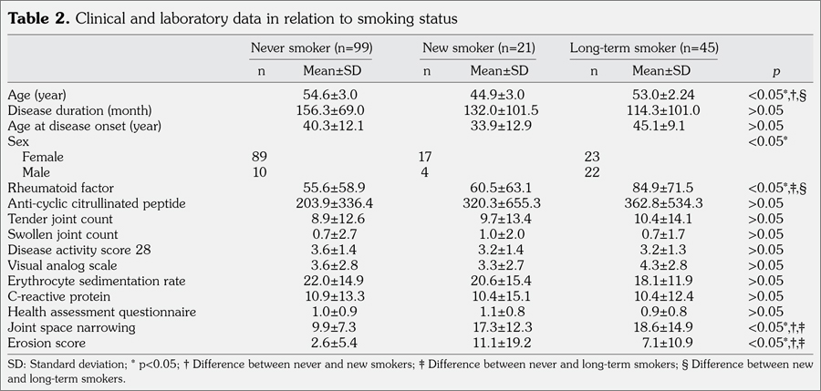 Results: Patients were divided into three groups according to their smoking habits. Ninety-nine patients (60%) were never smokers, 45 patients (27.3%) were long-term smokers and 21 patients (12.7%) were new smokers. Three groups were compared for disease activity. Disease activity score 28 scores were 3.2±1.2, 3.2±1.3, and 3.2±1.4, respectively (p>0.05). The erosion score (2.6±5.8, 7.1±10.9, and 11.1±19.2, respectively) and joint space narrowing score (9.9±7.3, 18.6±14.9, and 17.3±12.3, respectively) according to modified Sharp method were significantly lower in never smokers group than other groups (p<0.05). RF titrations were 55.2±58.9, 60.5±63.1, and 84.9±71.5, respectively, and levels of long-term smokers group were significantly higher than the other groups (p<0.05). Joint space narrowing score was 16.2±11.9 and 6.4±10.4 in RF (+) and RF (-) patients, respectively (p<0.05). There was no significant relationship between anti-cyclic citrullinated peptide levels and others parameters.