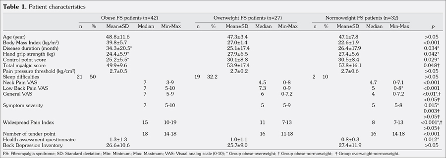 Patients and methods: The study included 42 obese (mean age 48.8±11.6; range 24 to 65 years), 27 overweight (mean age 47.3±3.4; range 24 to 61 years) and 32 normoweight (mean age 47.1±7.8 years; range 31 to 60 years) female FS patients. Widespread pain scores and symptom severity scores were noted. Pain pressure thresholds of tender points and control points were measured and total myalgic score (TMS) was calculated. The anthropometric assessments and skinfold measurements of all participants were recorded. Quality of life was evaluated by Health Assessment Questionnaire while psychological status was evaluated using Beck Depression Inventory.