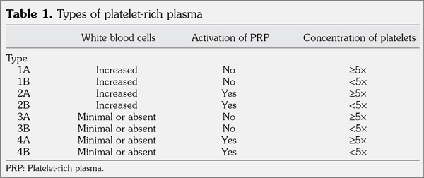 In average, PRP has three- to five-fold higher platelet count compared to whole blood. There are no widely accepted and quantified values of platelet concentrations in PRP.(5,6) There are four types of PRP; each of them has two subtypes based on the platelet and leukocyte counts as well as activation of PRP (Table 1). The use of leukocyte-rich (type 1) PRP (LR-PRP) may produce a more intense local inflammatory response and be associated with an increased post-injection pain response.(7-10) In this study, we aimed to compare the effect of leukocyte concentration in PRP on pain, functionality and post-injection local inflammatory reactions in patients with lateral epicondylitis.