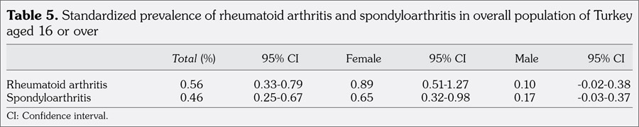 The standardized RA prevalence for the general population of Turkey was calculated as 0.56% (95% CI; 0.33-0.79), 0.10% (95% CI; -0.05-0.25) for males and 0.89% (95% CI; 0.51-1.27) for females (Table 5).