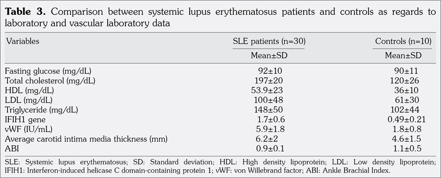 Patients and methods: The cross-sectional study included 30 consecutive SLE patients (2 males, 28 females; mean age 28±3.4 years; range 16 to 40 years) diagnosed according to the American College of Rheumatology revised criteria and 10 healthy age- and sex-matched controls (2 males, 8 females; mean age 27±2.5 years; range 22 to 23 years). SLE patients and controls were compared in terms of quantitative reverse transcriptase polymerase chain reaction gene expression of IFIH1 gene, von Willebrand factor, carotid intima-media thickness, and ankle brachial index.