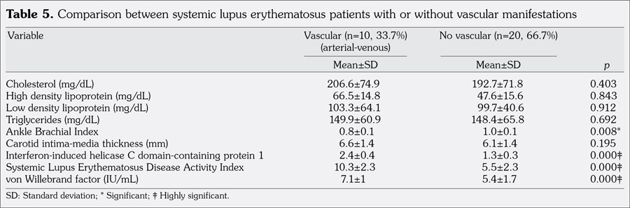 We detected no significant difference between patients with or without vascular affection regarding the lipid profile and CIMT (p>0.05). Furthermore, our study showed no significant difference between patients with arterial or venous affection regarding IFIH1 or vWF levels, indicating that venous affection was not benign compared to arterial disease as was previously thought.(21)