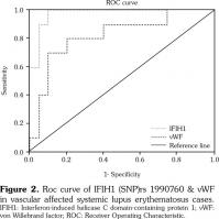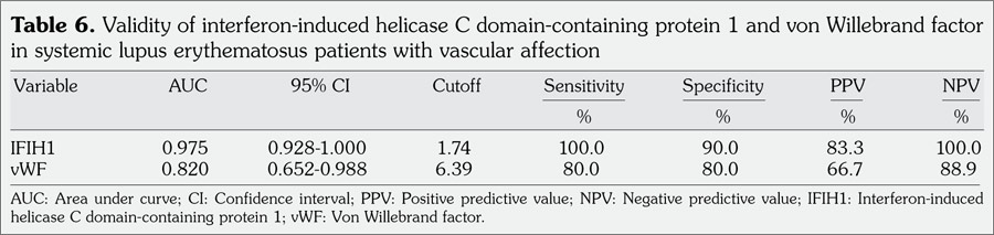 The strong positive relationship of IFIH1 and vWF with both types of vascular affection (arterial and venous) shows that both markers can indicate severe inflammation and ongoing destruction. IFIH1 gene may indicate endothelial dysfunction, increased plasma vWF levels and atherosclerosis in SLE.(6,7) Our study results supported this hypothesis by showing a statistically significant positive correlation between IFIH1 and vWF as a marker of endothelial dysfunction (p=0.001).