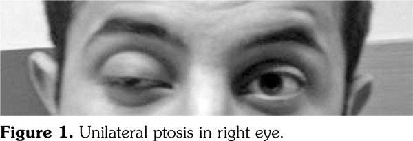 On clinical examination, he was conscious (Glasgow Coma Score: 15), his cooperation and orientation were full. There was ptosis in his right eye (Figure 1) and neurologic examination revealed third cranial nerve palsy on the right side, central facial paralysis and hemihypoesthesia on the left side of his face. Also, there was dysmetria and dysdiadochokinesia on the left side of his body. His right pupil was dilated and unreactive while there was no bilateral papilledema. Muscle strength was intact (5/5), deep tendon reflexes were normoactive and plantar reflexes gave flexor response bilaterally. He had a history of uveitis attack two months before but his eye examination was normal for this time. Other systemic physical examinations were normal.