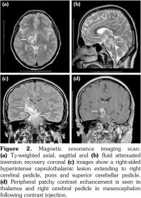 A contrast-enhanced cranial magnetic resonance imaging (MRI) was performed, which demonstrated a right-sided capsulothalamic lesion which was mild hypointense in T1-weighted images and hyperintense in T2-weighted/fluid attenuated inversion recovery images and extending from thalamus to the right cerebral pedicle, pons and superior cerebellar pedicle (Figure 2a-c). Peripheral patchy contrast enhancement was seen in thalamus and right cerebral pedicle in mesencephalon following contrast injection (Figure 2d). This lesion was interpreted as NB involvement of CNS. In diffusion MRI, defined lesion showed iso-hyperintense areas in diffusion-weighted images and low apparent diffusion coefficient. There were millimetric contrast-free parietal subcortical white matter lesions bilaterally in centrum semiovale and corona radiata level. Diffusion MRI findings were also interpreted as vasculitic lesions. Contrast- enhanced computed tomography (CT) and CT angiography of abdomen and thorax were performed for the exclusion of any thrombus or aneurysm and no abnormalities were observed.