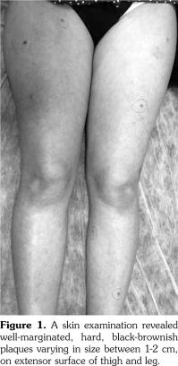 A 37-year-old female patient presented to our clinic with a four-month history of asymptomatic lesions on the torso and in the lower extremities. Patient history revealed that the patient had presented to a hospital five years earlier due to the complaints including photosensitivity, malar rash, oral aft, hair loss, fatigue, and arthralgia and had been diagnosed as having systemic lupus erythematosus (SLE) depending on the clinical signs and symptoms including an erythrocyte sedimentation rate of 83 mm/hour and positive antinuclear antibodies and anti-double stranded deoxyribonucleic acid. Subsequently, the patient had been initiated on methylprednisolone 64 mg/day and hydroxychloroquine sulphate 400 mg/day. For the last five years, the patient had been using systemic methylprednisolone and hydroxychloroquine sulphate at varying dosages. The patient had no history of trauma, injection, or insect bite. A skin examination revealed well- marginated, hard, black-brownish plaques varying in size between 1-2 cm, with three plaques on the anterior torso and six plaques on the extensor surface of the thigh and the leg (Figure 1). Histopathologic examination of a skin biopsy revealed a lesion containing oval fusiform cells and incarcerating collagen fibers was seen in the dermis (Figure 2). Depending on these sign and symptoms, the patient was diagnosed as having multiple eruptive dermatofibromas (MEDFs). No treatment was performed since the lesions resolved spontaneously.